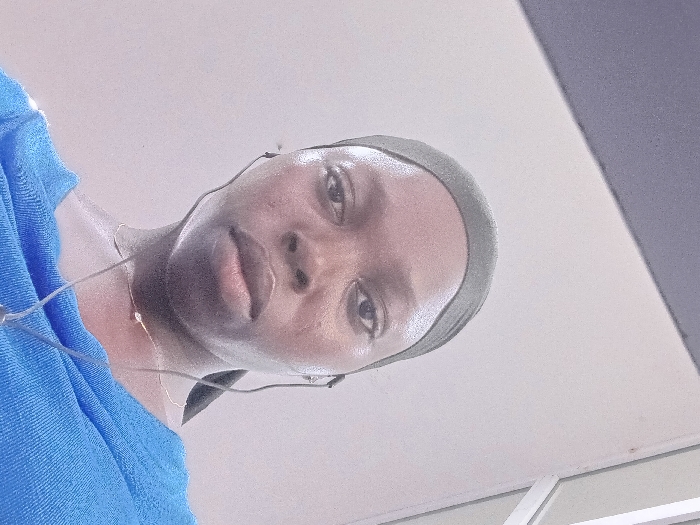 A female individual is depicted in a close-up, low-angle portrait, positioned indoors. She has dark skin and a neutral facial expression, looking directly towards the camera. She wears a dark olive-green head covering and a blue textured garment. Wired earphones are inserted into her ears, with the wires hanging down the front of her torso. A thin, gold-colored necklace with a small, clear, faceted pendant is visible around her neck. The background consists primarily of a light-colored wall. A dark gray or black surface is visible in the upper left corner, angled across the frame. In the upper right corner, white linear elements suggest a window or door frame. The scene is static, with the individual posing. Location: Indoor setting in the city of Unknown, Unknown.