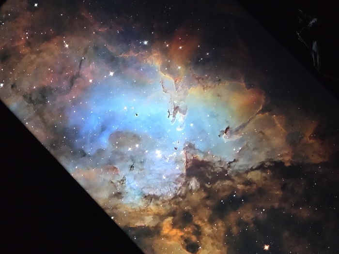 The image depicts an interior scene within an unidentified exhibition space or planetarium in Mezdra, Bulgaria. A large, diagonally oriented projection of a cosmic nebula dominates the frame. The nebula exhibits a central region of bright blue gas and dust, transitioning outwards into expansive formations of orange, red, and dark brown interstellar clouds. Numerous white stars are scattered across the projected field, which also features dark, pillar-like structures of dense gas. The projection surface, likely a curved screen or dome, is visible, with its upper-left portion truncated by a diagonal black boundary, indicating the edge of the display area and the dark, unilluminated room. In the bottom-right corner, a dark, indistinct shape, consistent with the top of a seated individual's head and shoulder or a piece of dark seating, is partially visible.