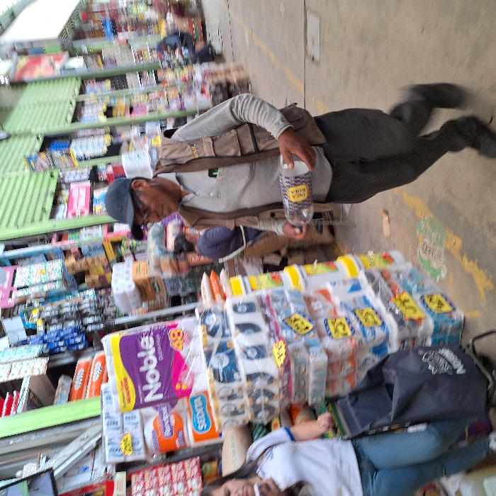 An outdoor market stall overflows with toilet paper, stacked high near a woman seated in jeans. A man in a cap, gray shirt, vest, and dark pants stands, holding an Inca Kola bottle. Shelves packed with goods line the background, blurring with distance. The scene appears to be a marketplace.