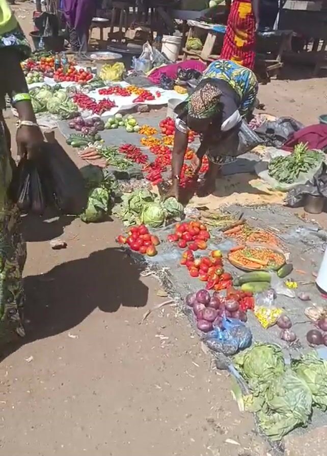 The video depicts an open-air market with a vendor arranging her produce on a grey mat spread on the ground. The display includes tomatoes, onions, cabbage, peppers, carrots, cucumbers, and other vegetables. A woman in a colorful patterned dress and headwrap is sorting through the items. Several people walk around the market, including a man in a green military-style uniform. There are buckets and other containers near the produce. The ground is dirt, and the scene is in bright daylight. Other vendors and customers are visible in the background.
