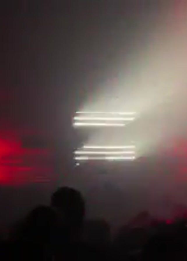 A dark concert or performance venue is filled with a dense fog. Bright white lights shine down from above, forming two stacked, rectangular shapes. Red lights are also visible on the stage, creating a layered lighting effect. In the foreground, the silhouettes of audience members are visible, with some raising their hands in the air. One person is holding a fan. The sound of electronic music plays in the background.