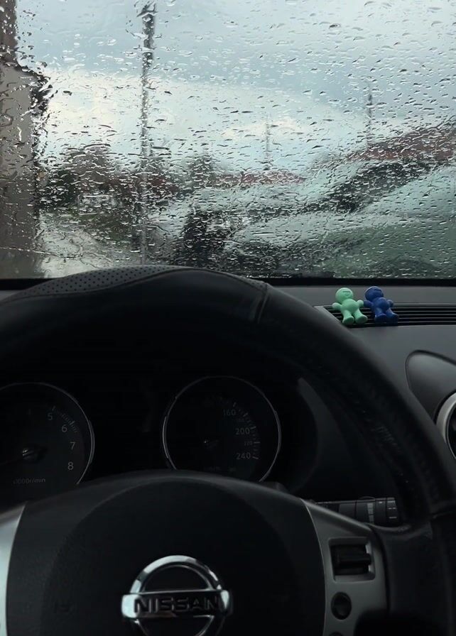 Nissan car's interior on a rainy day. The dashboard is visible, with two small toy figures, one green and one blue, resting on top of it. Raindrops cover the windshield, obscuring the view of the outside, which appears to be a parking lot with other cars. The steering wheel, with the Nissan logo, dominates the lower part of the frame, and the speedometer and tachometer are partially visible. The air vents are also visible on the dashboard. The overall tone is calm, highlighting the contrast between the cozy interior of the car and the rainy weather outside.