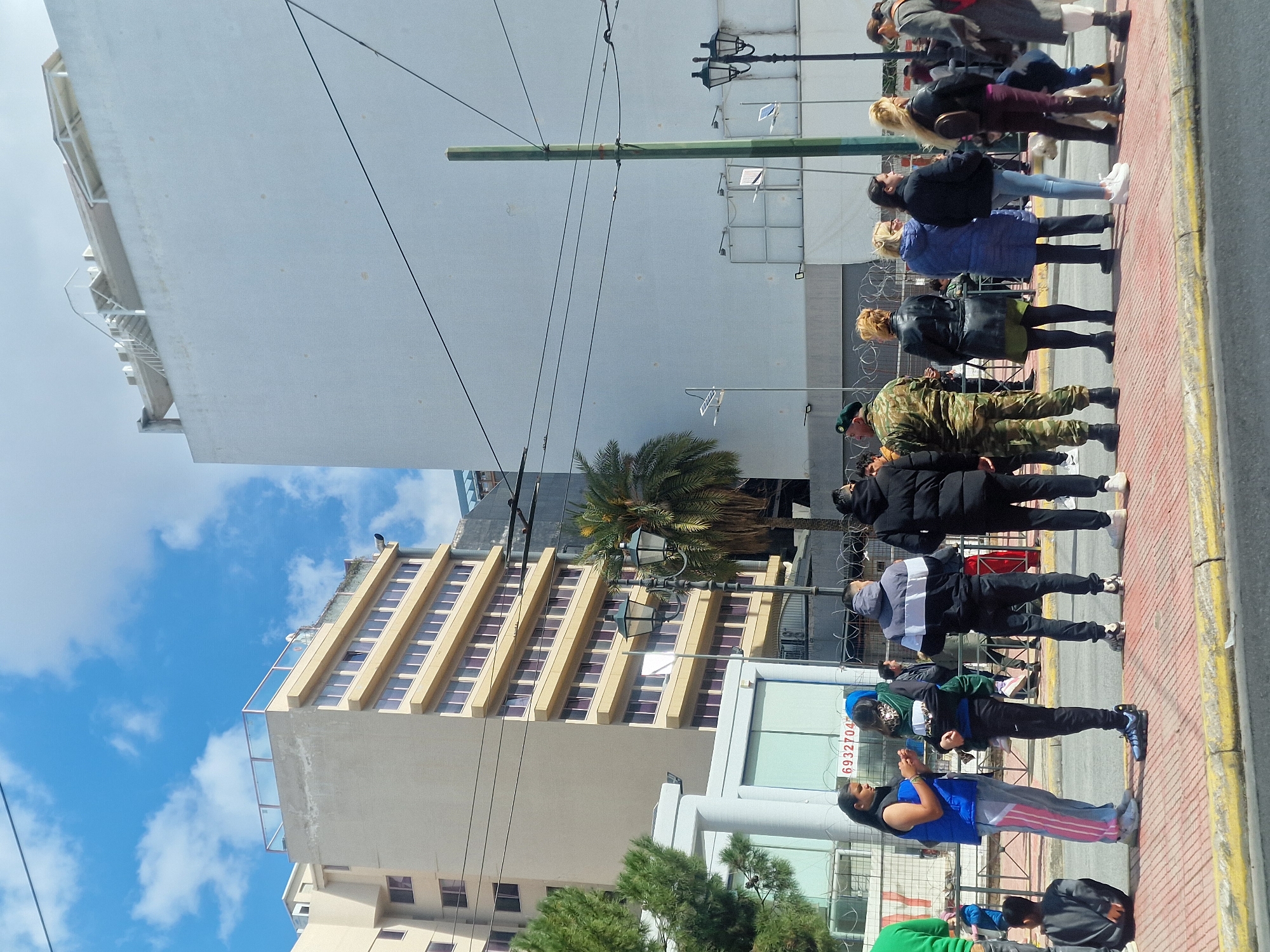 The image depicts an urban street scene in Athens, Greece, on a sunny day with scattered clouds. A diverse group of approximately 14 individuals stands on a red-patterned sidewalk with a yellow curb, facing generally away from the viewer, suggesting they are observing an event or procession. In the foreground, a young male sits on the sidewalk with his back to the viewer. To his right, a female with long dark hair, wearing a blue puffer vest and pink/grey striped sweatpants, stands looking at a small object in her hands. Next to her, an adult holds a child in a green jacket and blue hood. Further right, two males stand with their backs to the viewer, one in a black and white hooded jacket, the other in a black puffer jacket. Further along the sidewalk, a male in a Greek military camouflage uniform with an olive-green beret stands. To his right, a female in a black leather jacket and dark skirt, followed by another female in a long blue winter coat. A female in a black jacket and light blue jeans stands next, facing partially right. A blonde female in a black leather jacket and dark red pants stands with a small, light-colored dog near her feet. A person in a blue jacket kneels on the sidewalk near the dog. The last visible individual on the right is a female in a long grey coat. The background features several multi-story buildings. On the left, a tall, beige building with numerous rectangular windows with dark frames is partially obscured by an evergreen tree. Below it, a white building section with a transparent barrier displaying "6932704" is visible. In the center, a tall palm tree stands. On the right, a large, unadorned, light-colored building with a flat facade rises prominently, featuring a white external staircase and railings on its rooftop. Utility poles, including a tall green cylindrical pole, and power lines crisscross the frame. A black ornate street lamp with two lanterns is also visible on the right. Barbed wire tops a metal barrier behind the standing individuals.