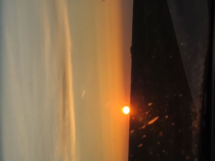 The image depicts a sunset over a flat, open landscape in Daskot, Bulgaria. The sun, a bright, circular, intense orange-yellow orb, is positioned on the horizon line, slightly left of the image center. The sky transitions from a deep orange and yellow directly above the horizon to a lighter orange and then a pale blue-grey at the top. Several horizontal cloud formations are present, including a prominent, elongated, darker orange band running across the middle-upper sky. The terrain below the horizon appears dark and indistinct, forming a silhouette, with a minor, subtle elevation visible on the horizon towards the right. The foreground reveals the interior of a vehicle, specifically the dashboard and the bottom edge of the windshield, which exhibits numerous bright, elongated, and circular light flares and reflections caused by the intense sunlight. No individuals or distinct man-made structures are visible in the landscape.