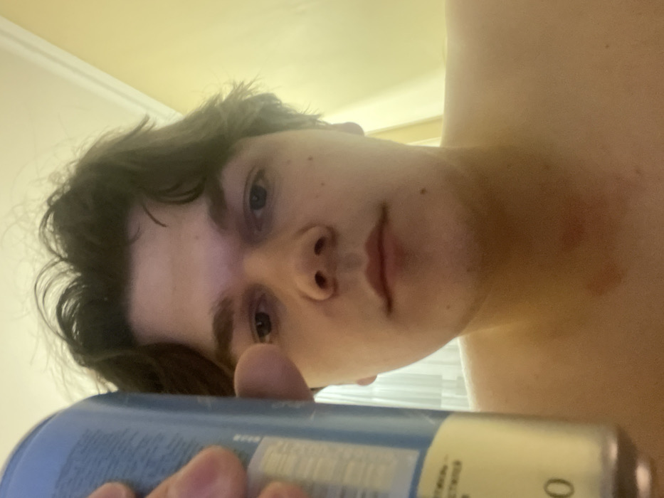 A young man with dark hair is the primary subject. He appears to be holding a cylindrical object, possibly a can, close to the camera. His face is visible, and the angle is tilted, creating an intimate, selfie-style perspective. Some skin redness is noticeable on his upper body, indicating potential irritation. The background is slightly blurred and suggests an indoor setting with a light-colored wall.