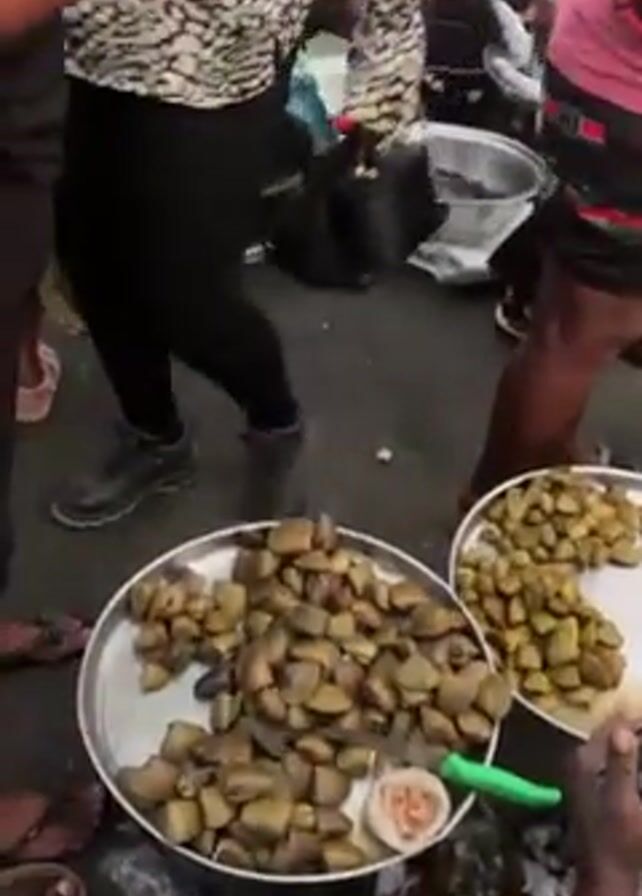 Here's a description of the scene: The video shows a low-angle view looking down on a street-level setup of food being sold