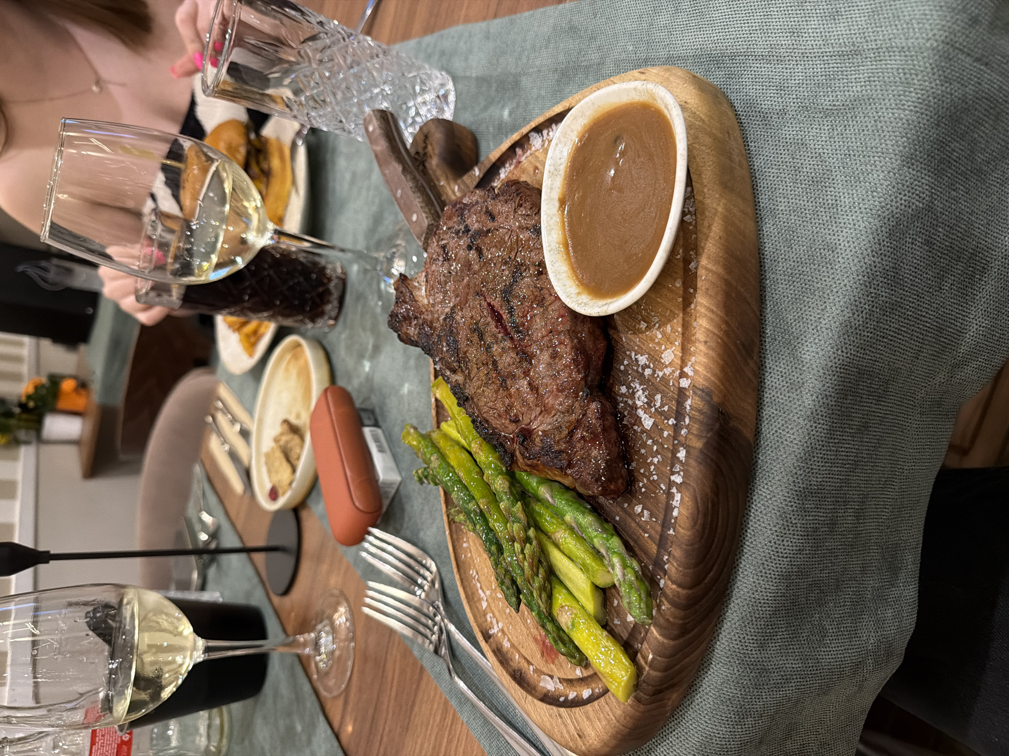 meal at a table, possibly in a restaurant, with a focus on a wooden serving board featuring a grilled steak, asparagus, and a small bowl of sauce