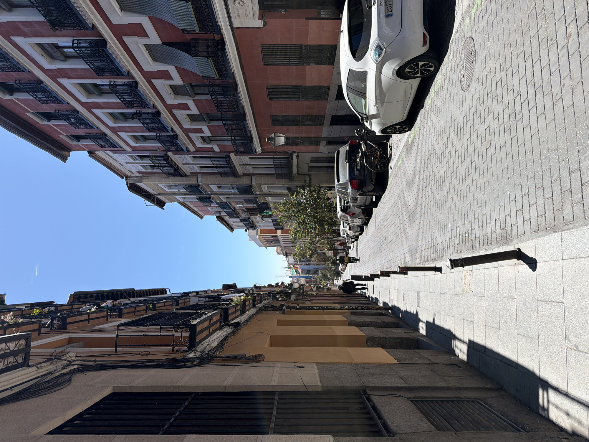 The image depicts a street scene in Madrid, Spain. The narrow street is lined with buildings of varying heights and architectural styles, ranging from older structures with wrought-iron balconies to more modern facades. Cars are parked along the right side of the street, a white one most clearly visible. Two people are walking in the distance, their shadows cast towards the foreground. The street is paved with rectangular blocks. The sky is clear and blue. The location is likely a residential area with a mix of old and new buildings. A series of pipes are visible along the right side of the road, near the foreground. The window of a building is prominent in the very foreground.