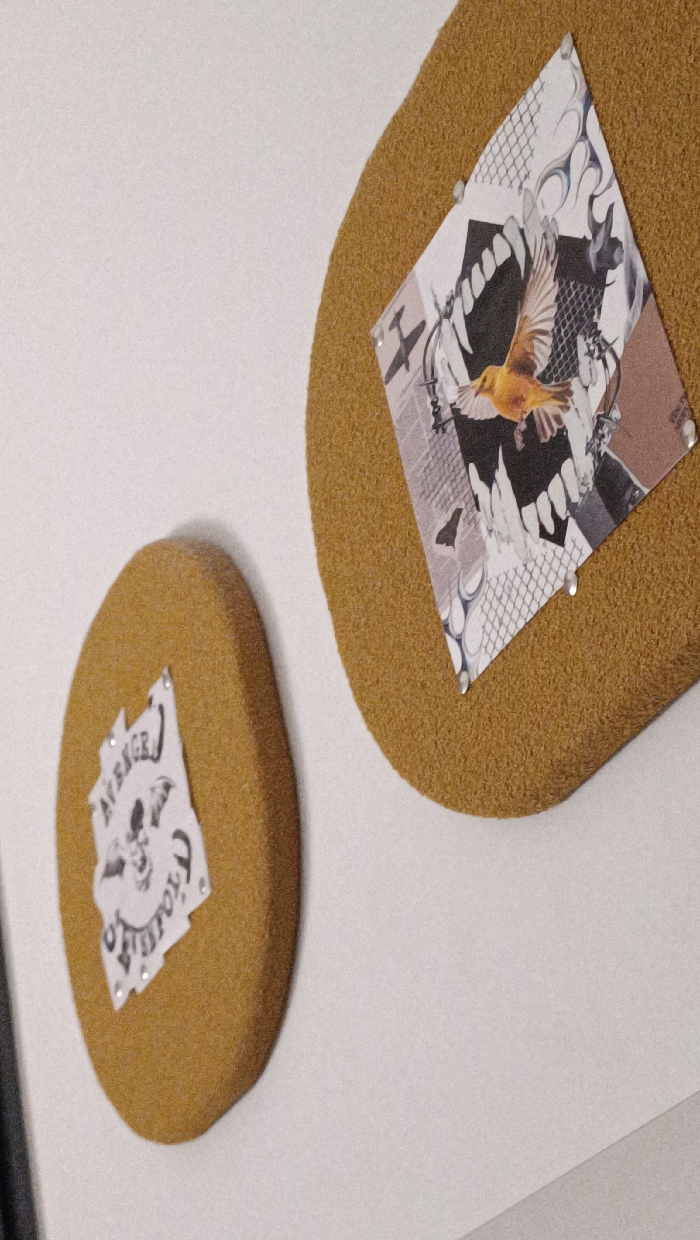 The scene is located in Sabadell, Spain. Two irregularly shaped, light brown cork boards are affixed to a plain white wall. The smaller, left-hand board, positioned slightly lower, has an irregularly cut white paper item pinned to its center with four metallic thumbtacks. This paper displays a black-and-white graphic featuring the word "AVENGER" at the top, a winged skull beneath it, and partially visible text "TOESPO[...]" below the skull. The larger, right-hand board, positioned slightly higher, features a diamond-shaped paper collage secured at each corner by metallic thumbtacks. This collage incorporates various graphic elements, including a central yellow-orange bird in mid-flight with outstretched wings, set against a dark background that includes prominent white tooth-like structures. Additional patterns visible within the collage consist of a gray grid texture, swirling lines, and a faint dark silhouette resembling an aircraft or industrial component. No individuals are present in the image.