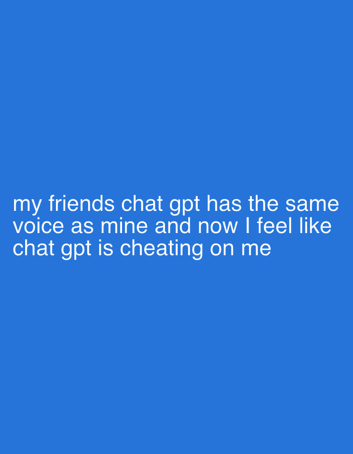 The image displays white text centered against a solid blue background. The text reads: "my friends chat gpt has the same voice as mine and now I feel like chat gpt is cheating on me". There are no visual elements depicting a physical location, individuals, objects, actions, interactions, or environmental details, therefore no information is available regarding the city of London, United Kingdom, or any other specific geographical area.