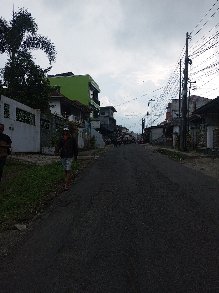 A street scene depicts a person walking on the left side of the road, followed by another person. Houses line both sides of the street, one notably painted green. Overhead, a dense web of power lines crisscrosses the sky. In the distance, a group of scooters or motorcycles can be seen. The road itself is asphalt, showing signs of wear and tear. The sky is overcast.