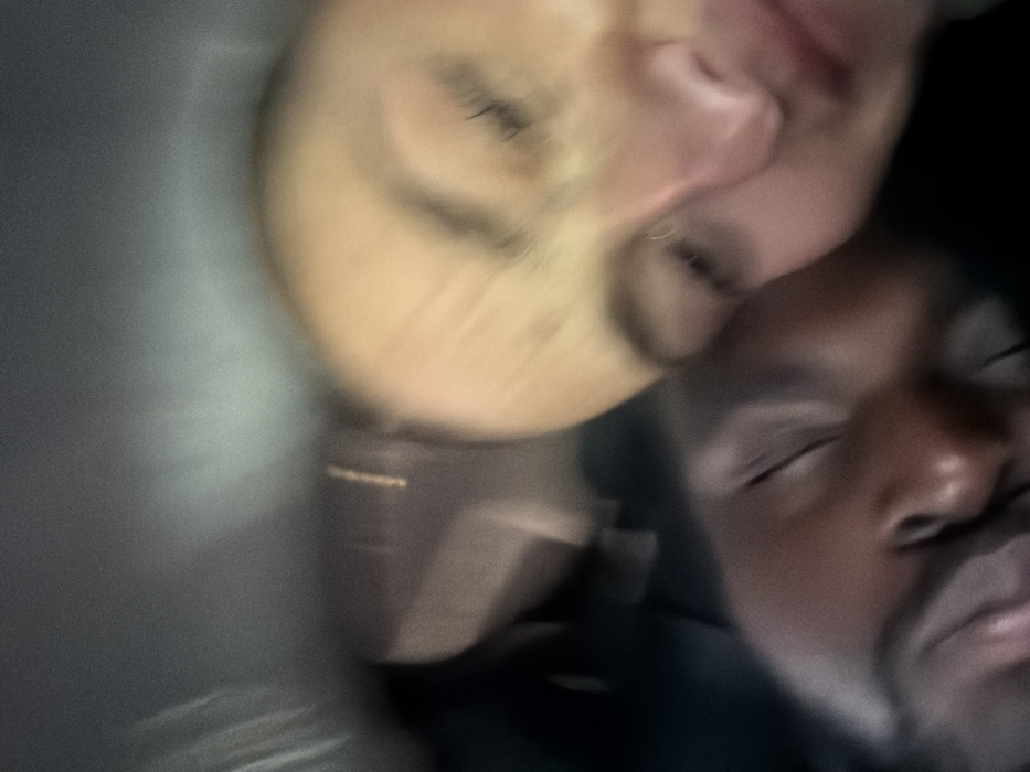 Two people, possibly a couple, are seen in a blurry, close-up image. One person has lighter skin and closed eyes. The other individual has darker skin and also has their eyes closed. The photo seems to have been taken at an odd angle and is blurry, making details difficult to discern.