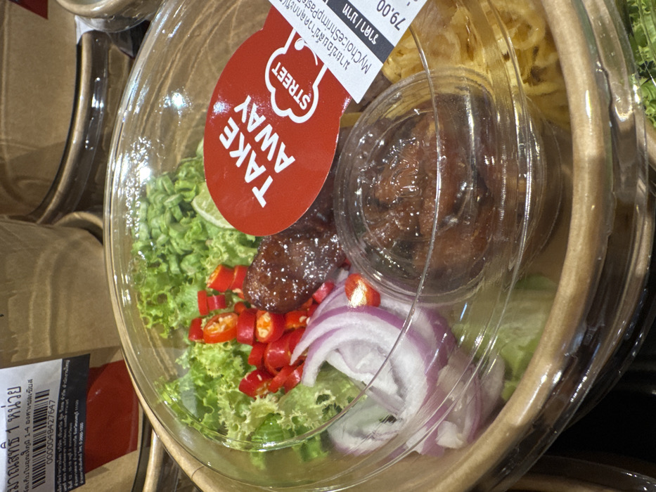 A clear plastic, round takeaway food container with a transparent lid is depicted, filled with various food items. The container holds green lettuce at its base, topped with slices of red onion, numerous bright red chili slices, and a dark brown, oblong food item. A small, clear plastic cup containing a thick, dark brown paste or sauce is centrally embedded within the main container. A lime wedge and yellow, shredded food components, possibly egg or noodles, are also visible. A red, irregularly shaped sticker adhered to the lid displays "TAKE AWAY" and "STREET" in white text. A partially visible white paper label with a barcode and Thai script is present on packaging behind the container, along with a white price tag showing "79.00" and "MyChoice Shrimp Paste" partially visible to the right. The background features several stacked brown cylindrical containers. The scene takes place in an indoor retail environment, such as a supermarket or food market, located in Wichit, Thailand. No individuals are visible.