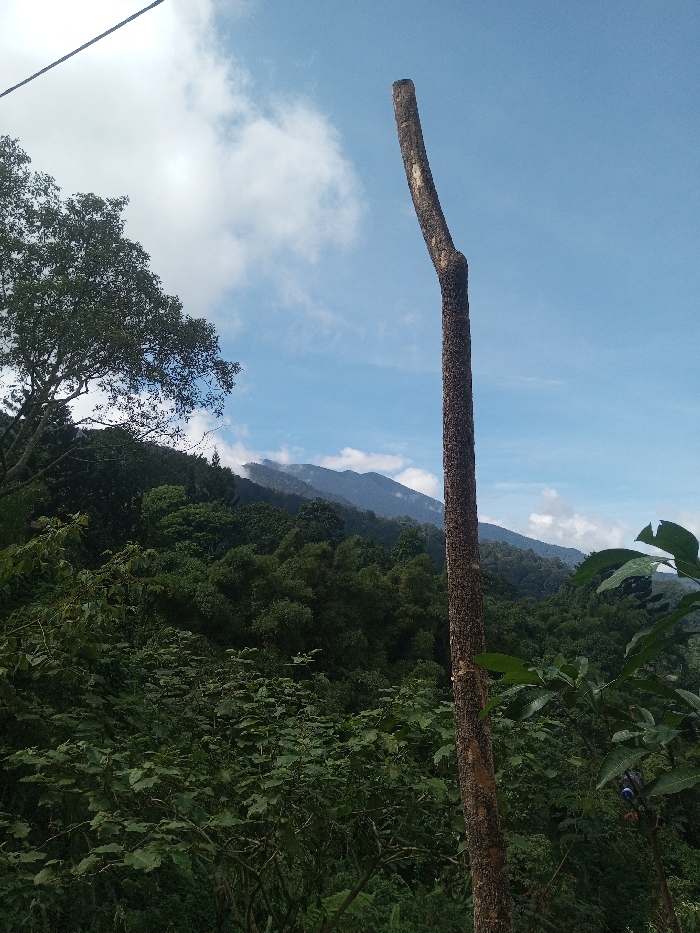 A vibrant scene showcases a lush green hillside under a partly cloudy blue sky. A tall, stripped tree trunk stands prominently in the foreground. Dense foliage covers the slope, with taller trees reaching towards the sky. In the distance, mountain peaks are softly veiled by clouds. An overhead power line adds a human element to the otherwise natural landscape.