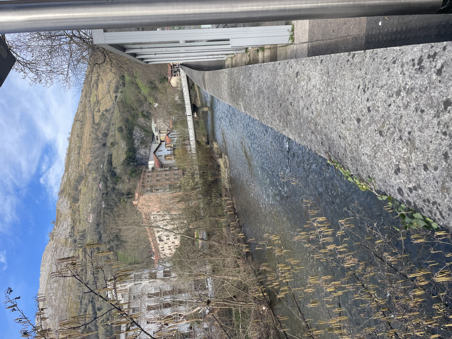 The image displays a daytime scene along the Urola River in Azpeitia, Spain, under a blue sky with scattered white clouds. In the foreground, a weathered grey concrete parapet, likely forming part of a bridge or riverside walkway, extends diagonally from the lower right towards the center. Its surface shows dark speckled discoloration and some green ivy growth on its river-facing side. To the immediate right of the parapet, a portion of a vertical, cylindrical silver metallic structure is visible. The Urola River occupies the mid-ground, flowing from the left towards the right, exhibiting clear, rippled water. The river's far bank is densely lined with bare deciduous trees, many of which bear numerous elongated, pale brown catkins or seedpods. Behind the trees, a residential area is visible. On the far left, a multi-story white building with multiple windows is present. Central to the composition is a larger, multi-story building rendered in a light pink or terracotta hue. Further downriver (to the right), a white metal pedestrian bridge, characterized by a single arch or truss design, spans the river. Beyond the bridge, several smaller houses with varying architectural styles and red-tiled roofs are observed. The background is dominated by a large, steep mountain, covered in sparse vegetation and exposed rock formations. Small structures, appearing to be houses, are sparsely distributed across the lower slopes of the mountain. No individuals, explicit actions, or interactions are discernible within the frame.