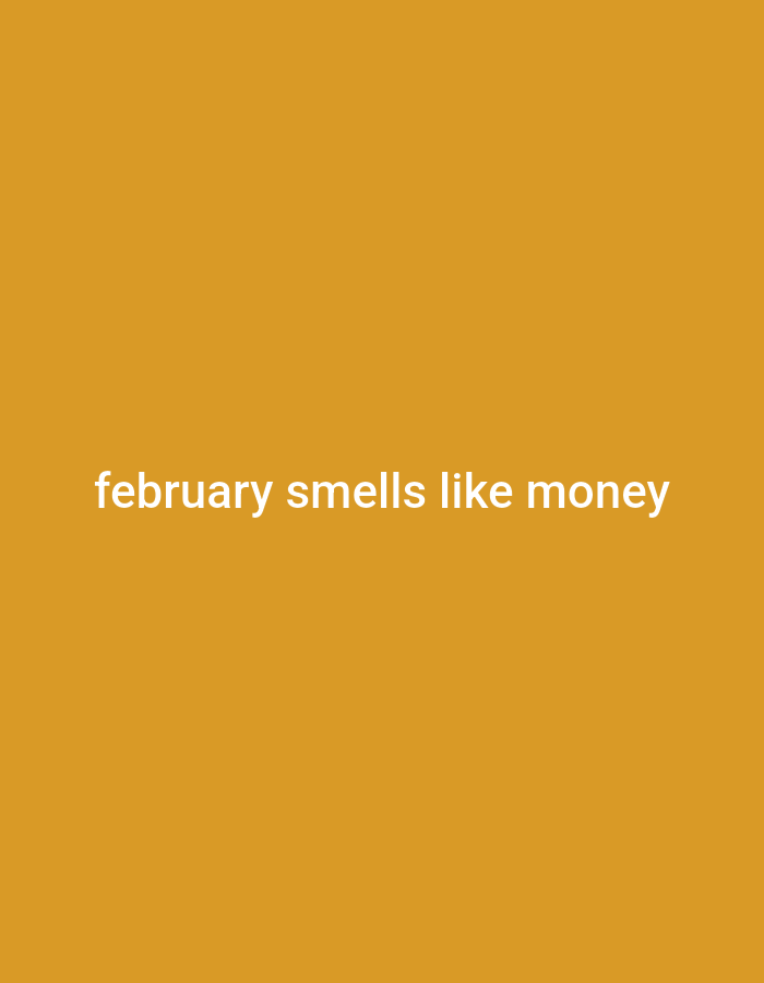 The image displays a solid, uniform ochre-yellow background. Centrally aligned horizontally in the lower-middle section of the frame, white sans-serif text reads 'february smells like money'. There are no other discernible subjects, objects, individuals, actions, interactions, or environmental features within the visual composition. The scene depicts a textual statement on a colored field, with no specific geographic location, including any part of the city of Khiva, Uzbekistan, visibly represented.