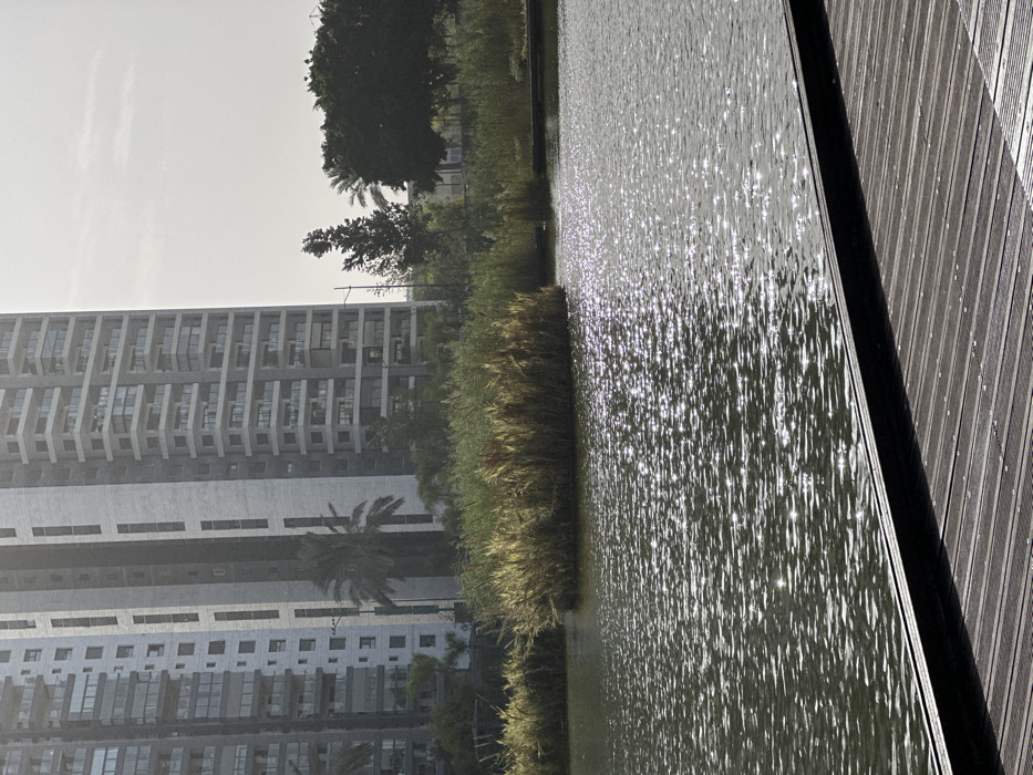 Water glistens near a wooden pier's edge. Reeds and trees border the water's edge, separating it from a tall building. The building is comprised of many windows and appears to be made of concrete. Above, the sky is overcast with minimal clouds.