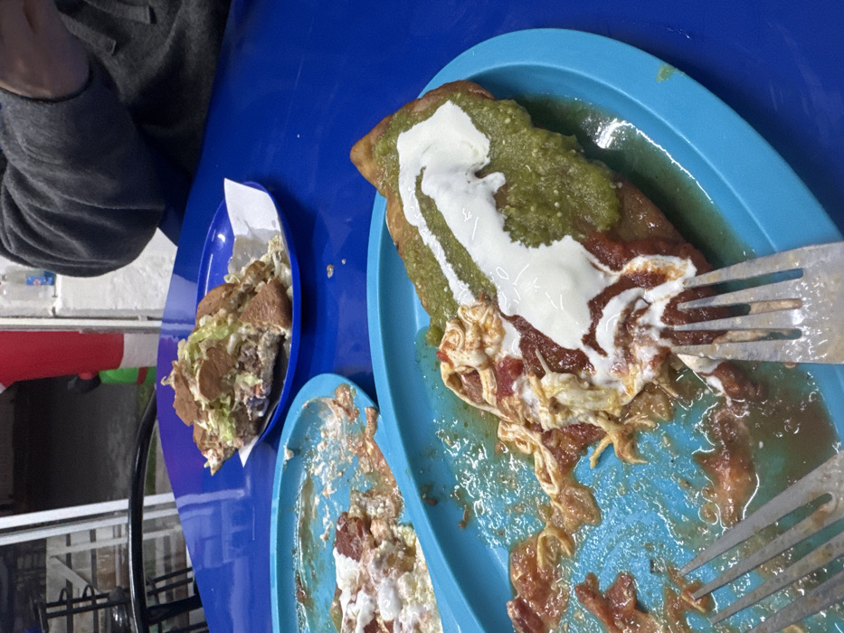 A blue table holds plates of Mexican food. A large, oblong sope topped with green salsa, shredded chicken, red sauce, and crema dominates the scene. A smaller plate to the left contains a torta with lettuce and other toppings. A third plate below shows remnants of a similar dish, mostly sauce and crema. A person's arm in a grey sweater is visible in the upper left. Silver forks are used to cut into the sope, indicating consumption.