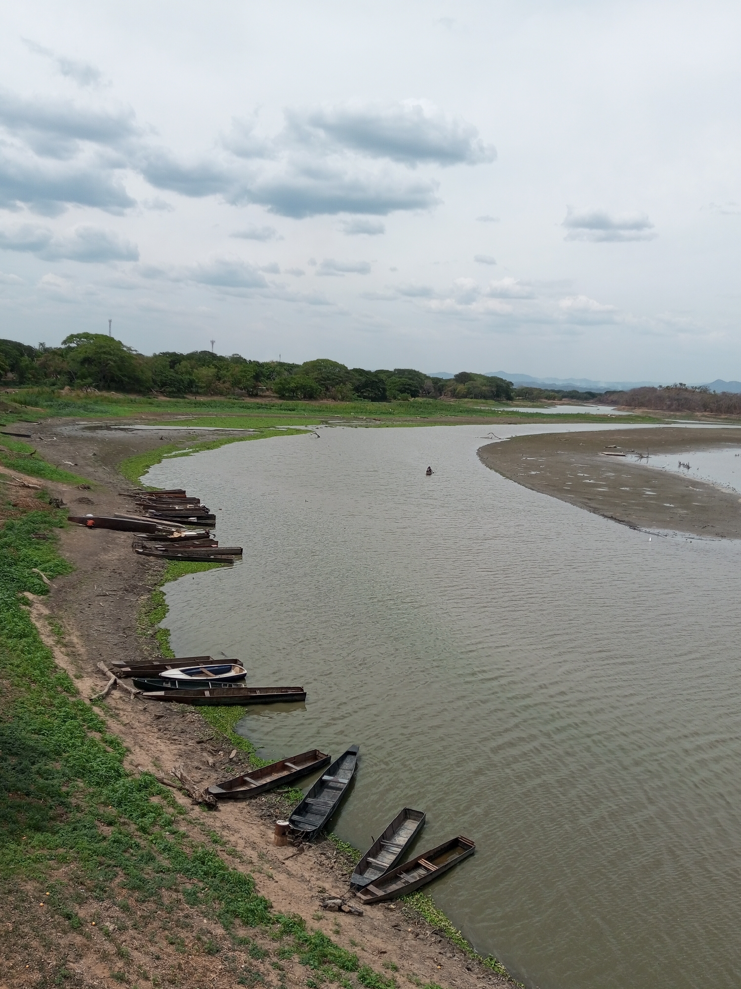 The photograph depicts a river scene in El Pao, Venezuela. The river, with murky water, curves through the landscape. A narrow, sandy bank lies exposed on one side of the curve. Several wooden boats are beached along the shoreline. A person is rowing a small boat in the river. The shoreline is characterized by vegetation. The background shows a landscape of trees. The sky is overcast with gray clouds. Distant hills or mountains are visible on the horizon.