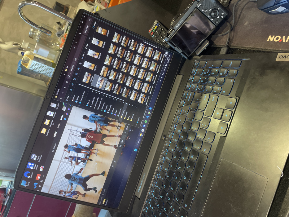 The image displays a black Lenovo IdeaPad Gaming laptop positioned on a dark countertop in what appears to be a kitchen or utility room. The laptop screen is open, presenting a photo management application. On the left pane, a prominent image captures an indoor volleyball game in progress, showing multiple players in light blue and red jerseys on a wooden court. One player, wearing number 9 in a blue jersey, is airborne near the net, while another, number 12, is in a defensive stance. The right pane of the screen shows a gallery view, displaying numerous thumbnail images, primarily of the same volleyball match, with filenames like "DSC0xxxx.JPG". The visible file path on the screen indicates "This PC > Local Disk (C:) > Users > Kristiyan - Personal". The laptop's keyboard is black with blue backlighting. To the right of the laptop, a black Sony ZV-E10 camera is present, connected by a cable, alongside a multi-colored remote control. A black mouse pad, partially showing a "CANYON" logo, and a black computer mouse are also visible to the right. The background features a stainless steel sink with a gooseneck faucet, a yellow cheese grater, clear glass containers, and a reddish-purple cabinet door on the far left. A specific location within the city of Burgas, Bulgaria, cannot be identified from the visual information provided in the image.