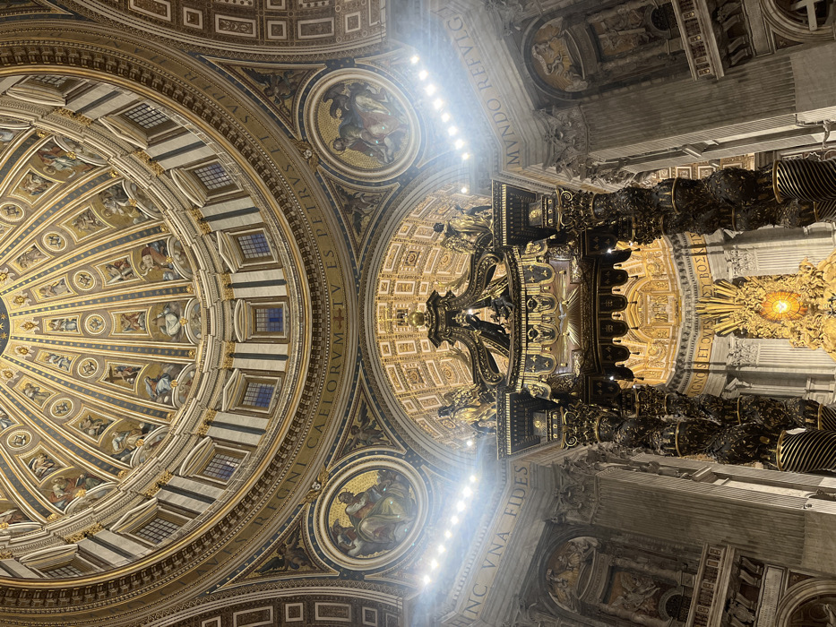 The image displays an upward-looking interior view of St. Peter's Basilica in Città del Vaticano, Vatican City. Dominating the mid-ground is the Bernini Baldacchino, an ornate bronze canopy supported by four spiraling columns, richly decorated with gold leaf, sculptural figures, and drapery-like elements, with a white dove visible on its underside. Partially visible beneath and behind the Baldacchino is the gilded Cathedra Petri, distinguished by a radiant sunburst motif. The upper portion of the frame is occupied by the interior of the basilica's dome. This massive structure features intricate gold-toned ribs and panels, each containing painted or mosaiced figures depicting saints, angels, and biblical scenes. Below the main dome, a drum section is visible, punctuated by multiple rectangular windows with blue panes. A frieze with Latin inscriptions runs beneath these windows. Arches supporting the dome are also adorned with circular mosaic medallions, each depicting multiple figures, and further Latin text. Bright artificial lights are visible along the architectural elements leading up to the dome, creating lens flare. The surrounding architectural details include sculpted pilasters and cornices. No individuals are present in the visible scene.
