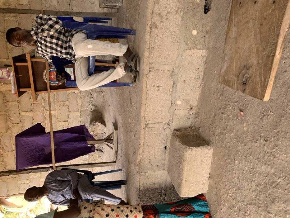 The image captures an indoor scene in Egbedi, Nigeria, within a structure featuring unplastered concrete block walls and a dirt floor