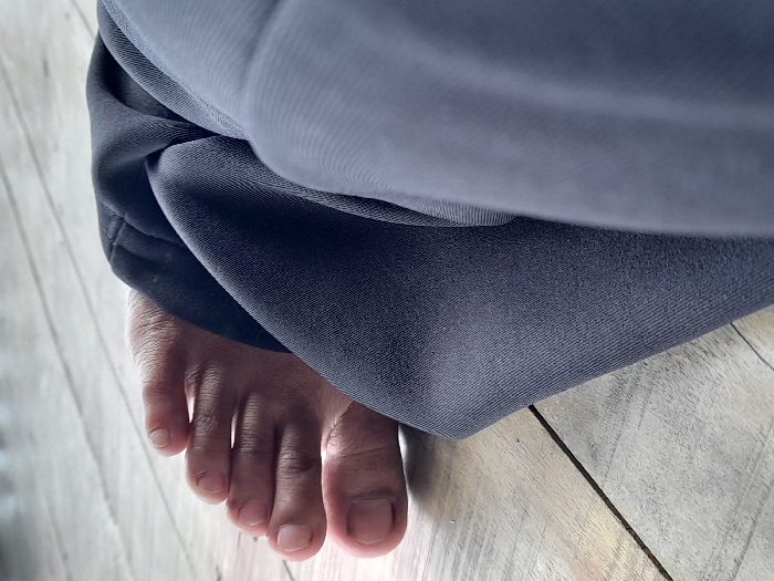 The image depicts a close-up view of a bare human left foot and the lower portion of a leg, clothed in dark grey fabric, resting on a light-colored wooden plank floor
