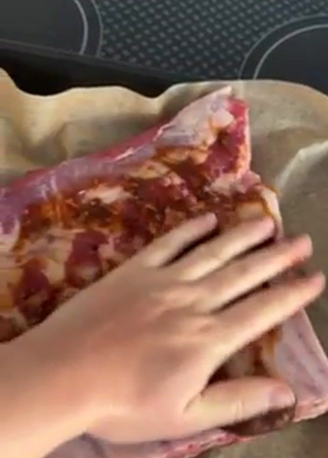 - "A high-angle close-up shot shows a hand spreading a dark brown marinade on a slab of pork ribs laid on parchment paper on a baking sheet" by FM-RZ2bK2, licensed under CC BY 4.0