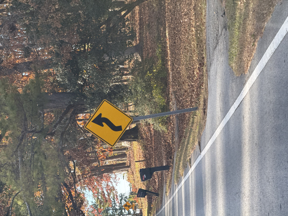 A roadside view features a winding road sign indicating a sharp left turn, positioned next to a paved road