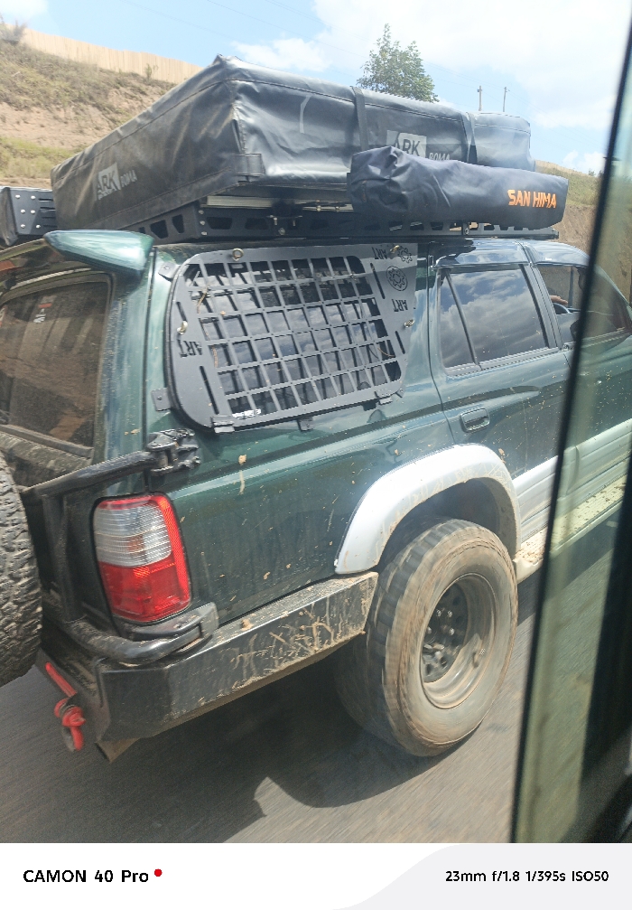 The image displays the rear three-quarter left view of a dark green, mud-splattered sport utility vehicle, consistent with a Toyota 4Runner model, in motion on a paved road under a bright, partly cloudy sky. The vehicle is outfitted with a black roof rack supporting a large, black, soft-sided rooftop tent or storage bag labeled "ARK ROMA," and a smaller black cylindrical bag marked "SAN HIMA" in orange lettering. A black, grid-patterned security or cargo panel, bearing "ART" branding, is affixed over the rear left side window. An aftermarket black bumper features a spare tire mounted on the rear left and a red recovery shackle. Large, muddy off-road tires on black rims are visible, exhibiting motion blur. Light-colored aftermarket fender flares protect the wheel wells. The background shows a sloping dirt embankment or hillside on the left and minimal vegetation. No individuals are distinctly visible within the vehicle. The scene is situated in Lari/Kirenya ward, Kenya.