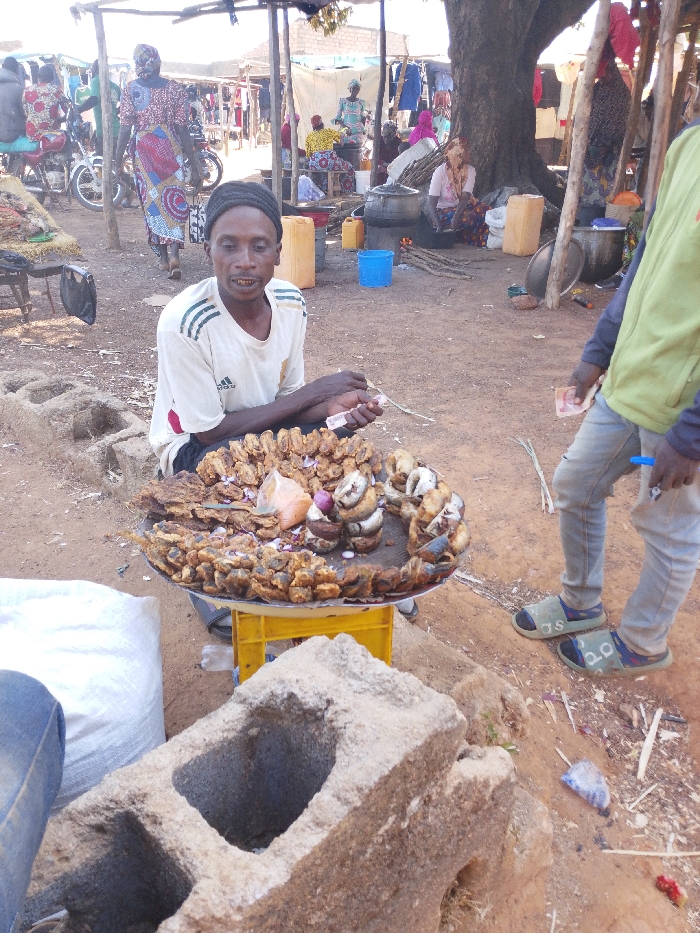 A man sits behind a tray piled with fried food and onions, counting money in his hands. A customer stands to his right, wearing jeans and sandals, holding a piece of paper. The food tray rests on a yellow plastic crate. Behind them, a busy outdoor market bustles with people, motorcycles, and makeshift stalls under trees and canopies. Cooking pots and containers are visible, suggesting food preparation. A hollow concrete block sits in the foreground.