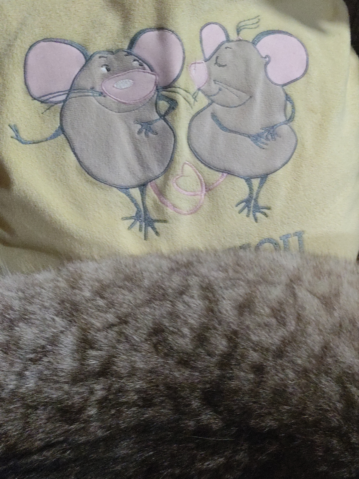 yellow piece of fabric with two cartoon mice embroidered on it. The mice are gray with pink ears and are facing each other. Below the fabric, a dark gray, furry surface is visible. The environment and location are not identifiable as Yerzhovo, Moldova.