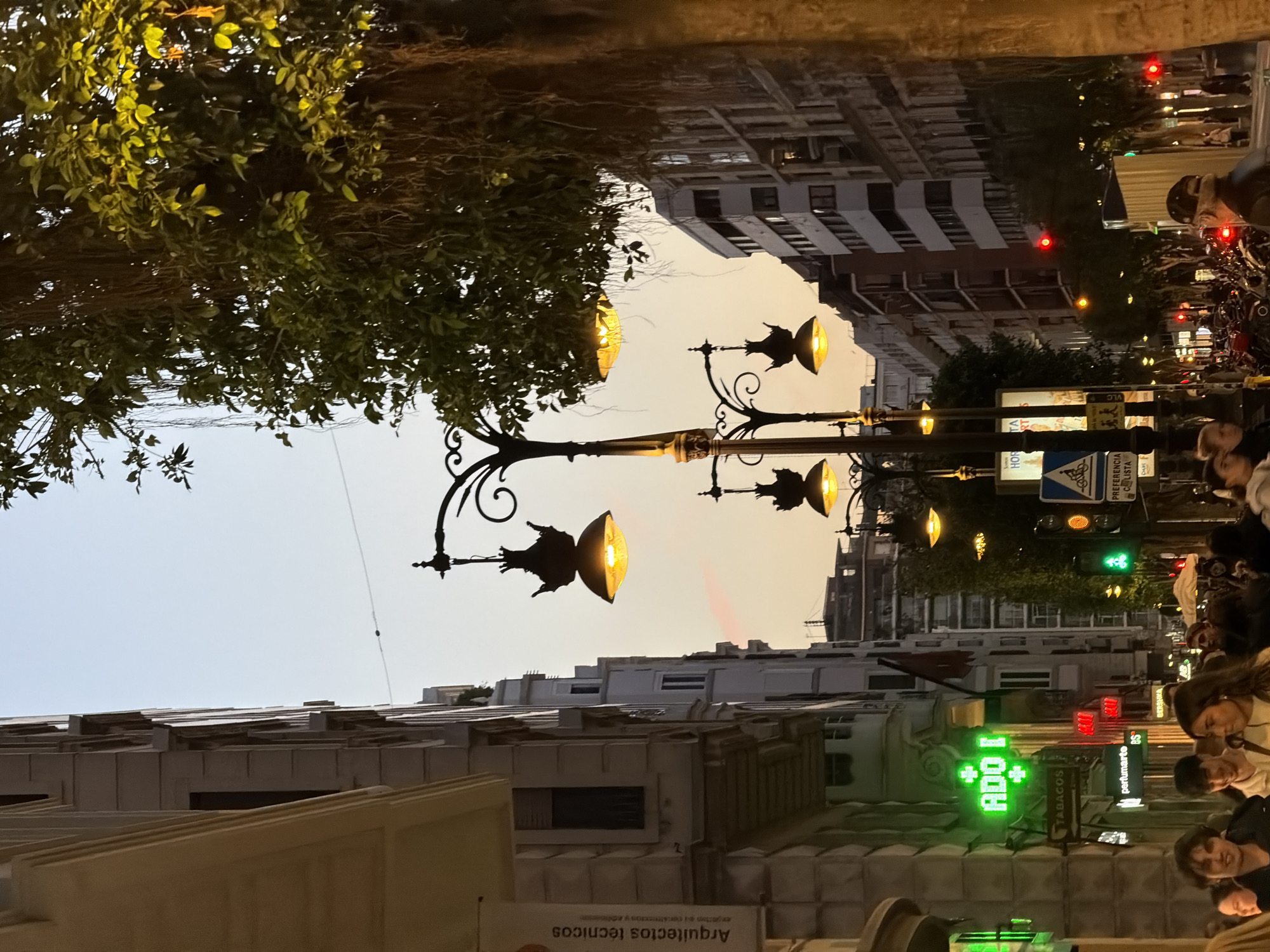 The image depicts a bustling urban street in València, Spain, at twilight. The sky transitions from a soft orange-pink near the horizon to a pale blue overhead. Ornate black streetlights with multiple fixtures emit warm yellow light, illuminating the scene from the foreground into the distance. Multi-story buildings with varied architectural styles line both sides of the street. On the left, a building features a "Arquitectos técnicos" banner and a prominent green neon pharmacy cross sign displaying "ADO I," with a "TABACoS" sign visible below it. A large tree with dense green foliage and numerous aerial roots occupies the right side of the frame, partially obscuring buildings. The street-level foreground is populated by a dense crowd of pedestrians moving in various directions. Further down the street, red and green traffic lights are visible, along with multiple parked motorcycles. Additional signs such as "Perfumarte," "BERSHKA," "PREFERENCIA CICLISTA," and "HOSPITAL" are also present.