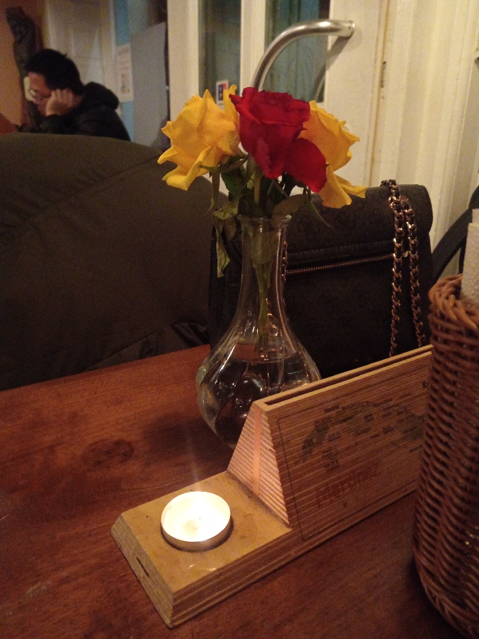 The image depicts an indoor scene within a restaurant or cafe setting in Dresden, Germany. A polished wooden table surface occupies the lower half of the frame. On the table, a lit tea light candle in a simple wooden holder emits a soft glow. Adjacent to the candle, a triangular wooden menu holder displays a map and text including "Havana" and "Куба" (Cuba). Directly behind these items, a clear glass vase holds three roses: two yellow and one red, all showing signs of wilting. A dark-colored handbag with a prominent gold-colored chain strap rests behind the vase. In the background to the left, a person with dark hair and glasses, wearing a dark jacket, is partially visible from the chest up, seated on a dark green upholstered chair or booth. This individual is leaning forward, with a hand near their face, appearing to be engaged in reading or quiet observation. To the right of the seated person, a light-colored door or wall with a silver-toned handle is visible. The overall lighting is subdued, suggesting an evening atmosphere.