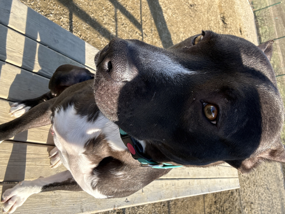 - "An image displays a bi-color Pit Bull type dog, predominantly dark brindle with white markings on its chest, muzzle, and paws" by FM-Q0AMB2, licensed under CC BY 4.0