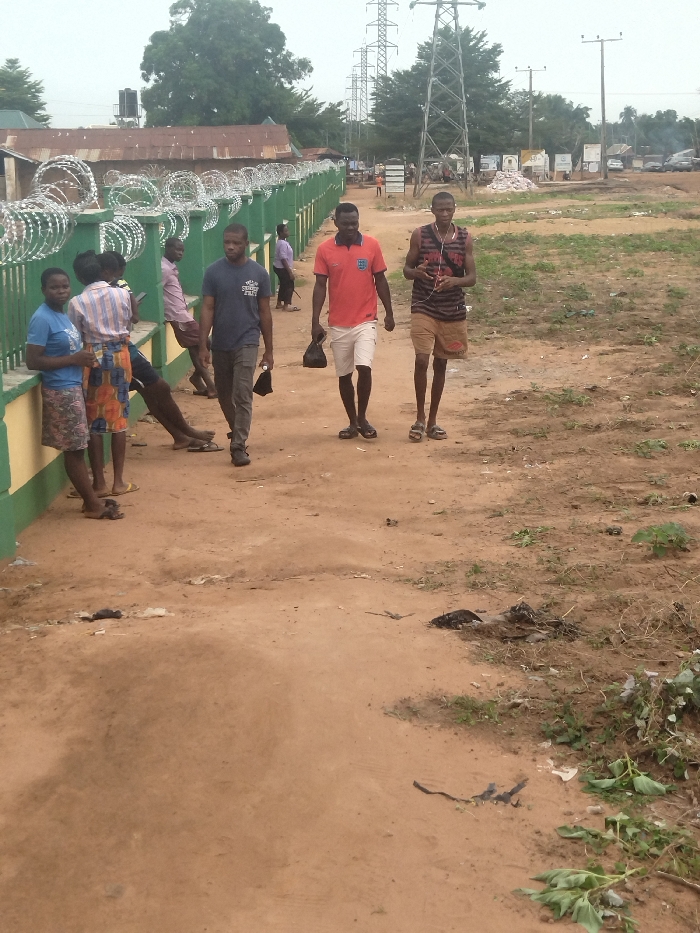 scene in Kanshio, Nigeria, at the coordinates 7.683° N, 8.537° E. There are seven people visible. Five of them are standing. One is a young boy, wearing a blue shirt and carrying a bag on his back. He is standing next to a young girl, wearing a blue dress. Another young girl, wearing a striped dress, is standing next to her. There is a man wearing a red shirt and khaki pants, standing next to another man, wearing a black sleeveless shirt and a black cap, and a third man is wearing a blue shirt and black pants. The scene appears to take place on a dirt road, in front of a green fence with barbed wire at the top. The fence runs along the left side of the image. The road is surrounded by brown dirt and sparsely scattered green vegetation. In the background, there are power lines, trees, and a few cars. The ground is mostly dry and dusty, with patches of green vegetation. The area looks to be outside and near a residential or commercial area.