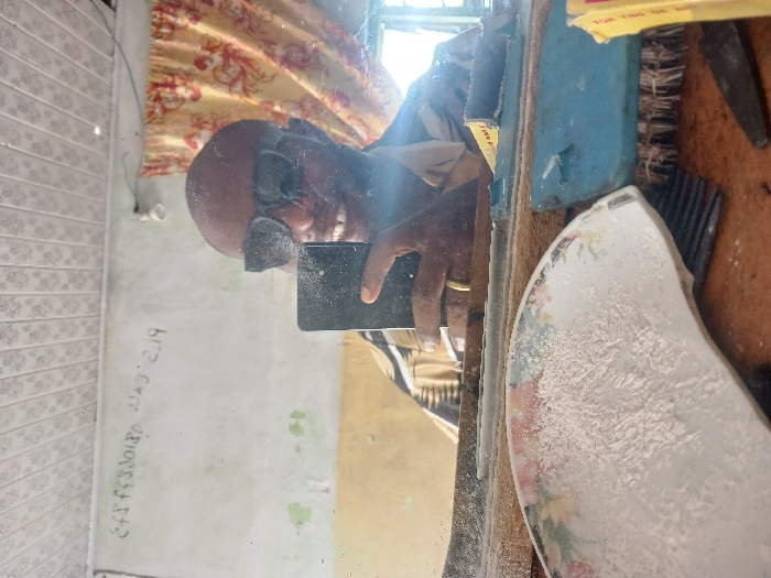 The image displays a mirror selfie of a bald male subject, presumed to be in a barbershop or a small service establishment in Okene, Nigeria
