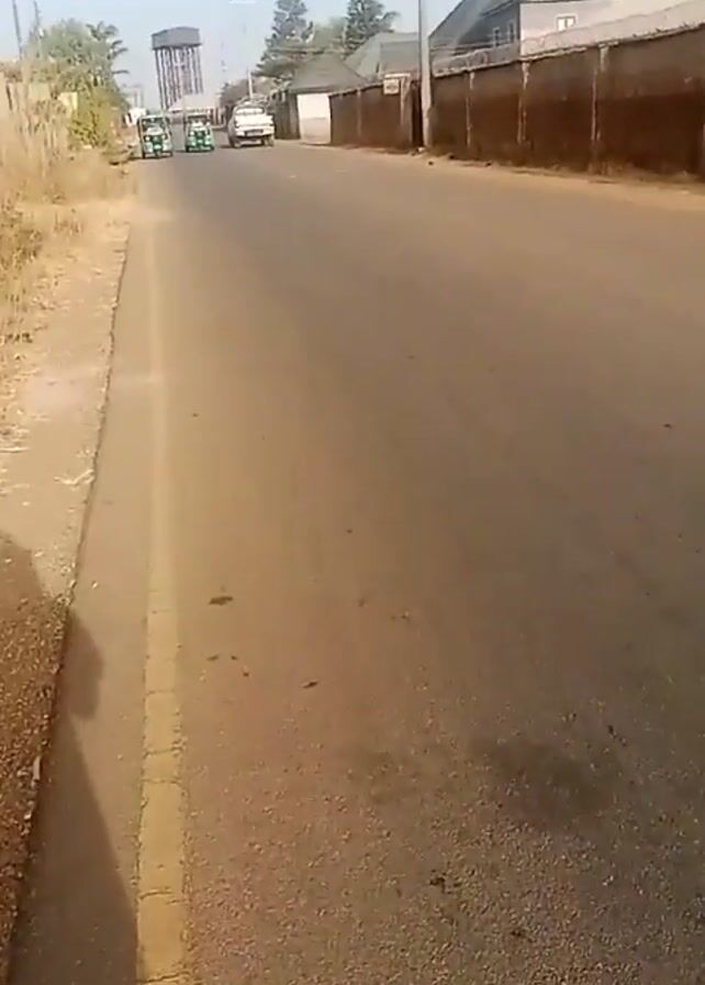 straight, paved road on a sunny day. On the left side of the road is a curb and some dry, grassy vegetation. On the right, there's a tall fence bordering some buildings. In the distance, a water tower is visible. Two green and white auto rickshaws, also known as "Keke Napep," are traveling down the road towards the camera. The camera remains stationary.