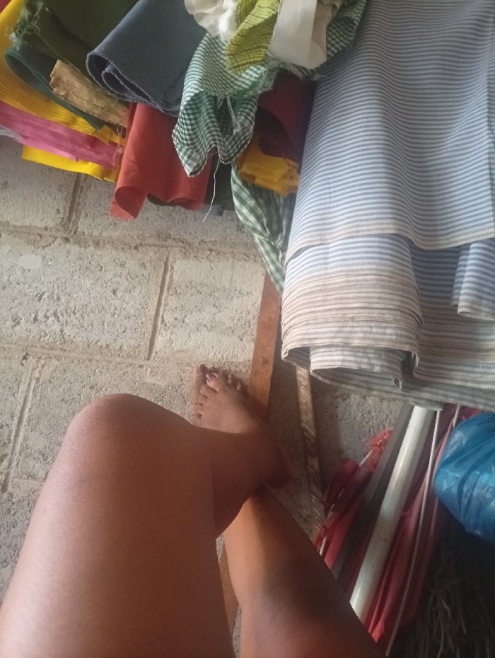 The scene, located in Maiburiji, Nigeria, captures an elevated, personal perspective focusing on a person's bare legs and feet. The subject's dark-toned lower extremities occupy the lower-left to central portion of the frame, with legs crossed or overlapped. The visible right foot exhibits dark red-brown painted toenails. The immediate background on the left is a light gray, textured concrete block wall. A wooden plank or beam runs horizontally near the bottom center. To the right of this, a cluttered storage area contains folded red fabrics, white tubular objects, a blue plastic bag, and dark interwoven material. The upper portion of the frame is filled with stacked textiles: colorful solid fabrics (yellow, pink, red, olive, dark blue, gold) on the left, and patterned fabrics including green and white gingham and a large quantity of light blue and white striped material on the right. No other individuals or active interactions are visible within the frame.