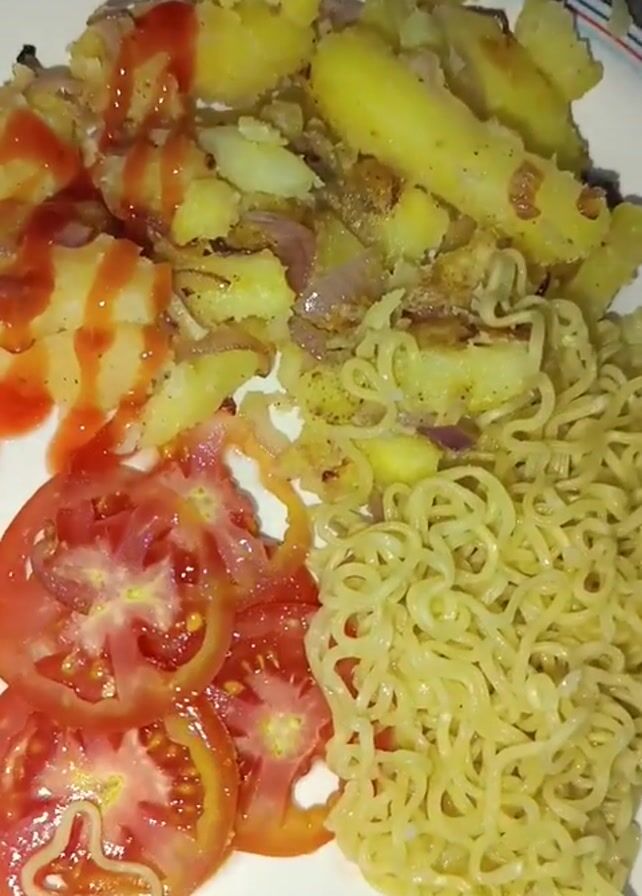 plate of food with a variety of items. The plate is white with a blue and red stripe near the edge. There are cooked potatoes mixed with what appears to be red onion, with a drizzle of what looks like ketchup on a portion of the potatoes. There are slices of tomato at the bottom left corner of the plate, and a pile of cooked noodles to the right. The plate is resting on what appears to be a dark surface. The lighting is somewhat dim.
