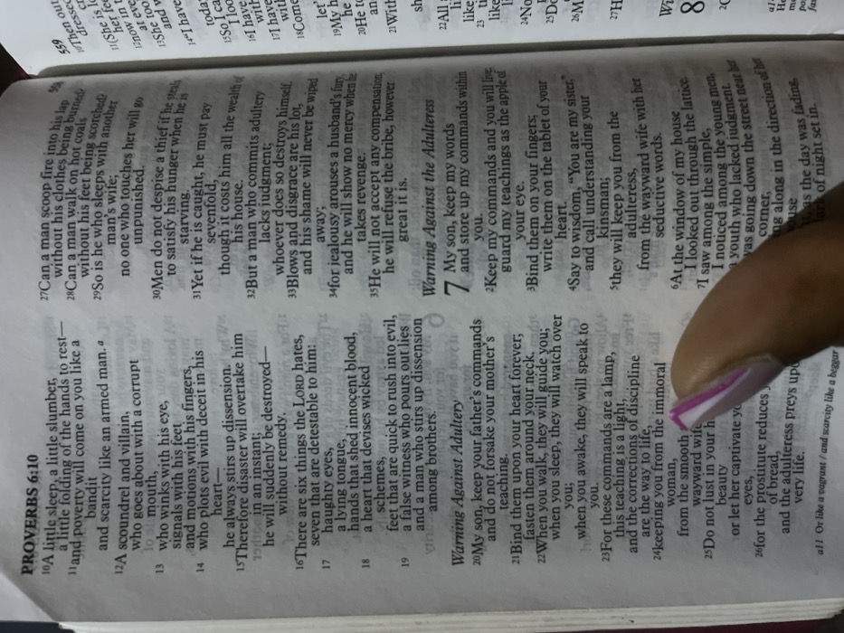 This image features two pages from the Book of Proverbs. Chapter 6, verses 10-19, warns against laziness and those who stir up dissension. It lists six things the Lord hates and seven that are detestable to him, including haughty eyes, a lying tongue, and hands that shed innocent blood. Following this, Chapter 7 warns against adultery, urging readers to keep their father's commands and store up wisdom. A hand with a french manicure is visible in the lower right corner.