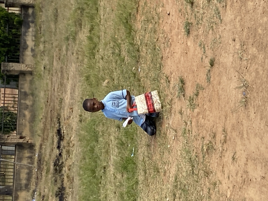 A young Black male child is depicted kneeling on dry, uneven ground characterized by exposed soil and sparse patches of green and yellowish vegetation. He wears a light blue short-sleeved collared shirt, likely a uniform, with dark blue trim on the collar and sleeves, and a square logo on the left chest. Striped dark trousers are visible beneath his shirt. In his left hand, he holds several small, white folded paper objects. His right hand grasps the red strap of a small, patterned tote bag or lunch bag that rests on the ground beside him. The bag is light-colored with red and black designs, including the visible text "Have a nice day." The child looks directly forward. In the background, a low concrete wall with dark metal fencing on top is present, with some green foliage visible beyond it. The scene is located in the city of Du, Nigeria.