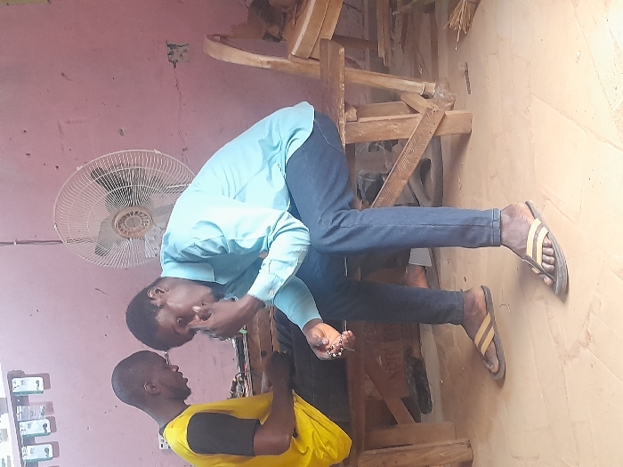 Two men are interacting inside a room. The man in a light blue shirt and dark jeans is leaning over towards the other man, who is wearing a yellow shirt with black sleeves. The man who is leaning over is also holding a string with beads or small objects attached. They are standing near some wooden furniture and a white electric fan. The walls are painted in shades of pink and beige.