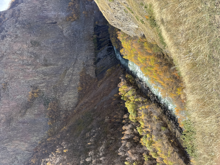 The scene depicts a deep river gorge within the city of Kvemo Okrokana, Georgia. A rapidly flowing river, characterized by light blue-green water and white rapids, traverses the lower central portion of the image. The river is bordered by steep banks heavily forested with deciduous trees displaying prominent autumn foliage in vibrant shades of yellow, orange, and some lingering green. Towering, vertically striated rock walls, indicative of columnar geological formations, flank both sides of the gorge, rising steeply. The left rock wall is partially shadowed and features several small waterfalls cascading directly into the river. The right rock wall is illuminated by sunlight. The immediate foreground consists of dry, golden-brown grass on a downward slope. No individuals, animals, or anthropogenic structures are present.