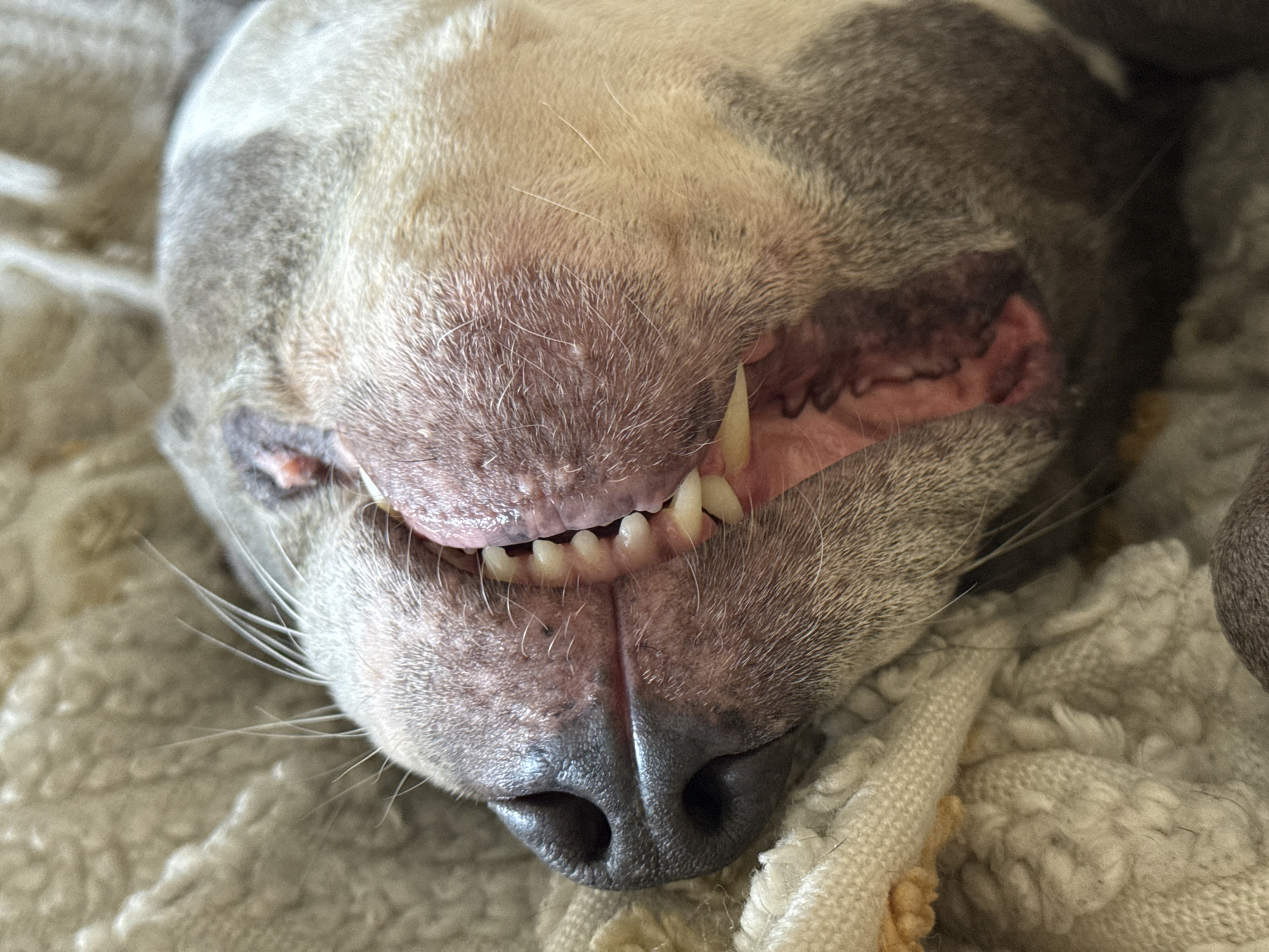 A close-up photograph shows the upside-down face of a dog with gray and white fur. The dog's mouth is slightly open, revealing its teeth and gums. The nose is black and shiny. The dog is lying on a beige, textured surface. There is no indication of the image's location being Esch-sur-Alzette, Luxembourg, or any people, actions, or interactions visible in the image.