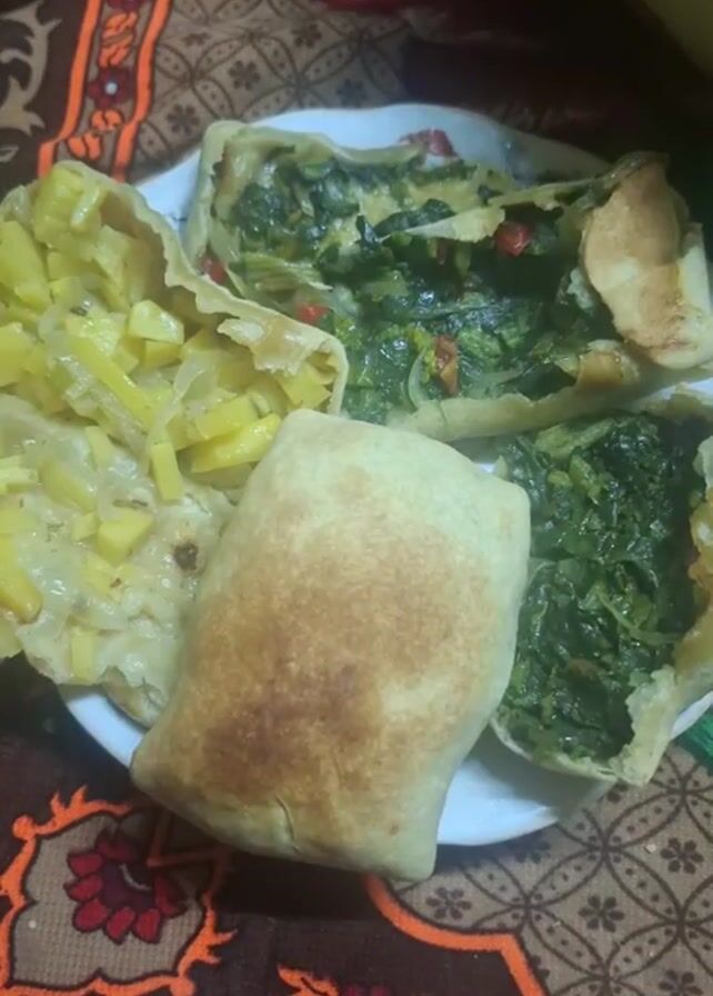 - "A plate on a patterned tablecloth holds four pastries: one filled with cubed potatoes, two filled with spinach and red peppers, and one rolled up" by FM-h5fL72, licensed under CC BY 4.0