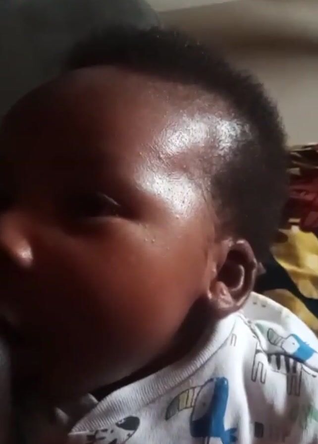 A baby of dark complexion nurses from its mother. The baby wears a white onesie with an all-over print featuring a variety of animals in a cartoon style. The mother's skin is also dark. The background includes a grey fabric and a multicolored patterned fabric. The scene appears to be indoors and dimly lit.