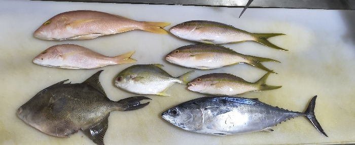 - "Nine whole, uncooked fish are displayed on a light-colored, reflective surface, likely a cutting board or counter, within a food preparation area in Cutler Bay, United States of America" by FM-TRqrf1, licensed under CC BY 4.0