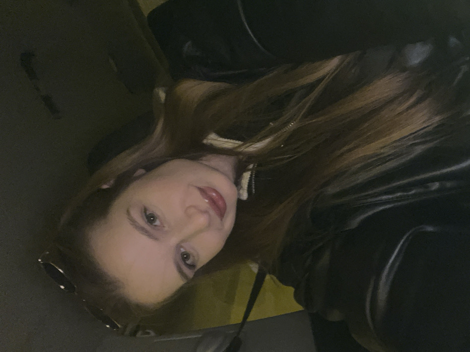 A woman with long, light brown hair poses. Her head is slightly tilted towards the camera. She wears a black leather jacket with a furry collar. A pair of sunglasses is visible on the left. The background is dark and indistinct, with a yellow patch.