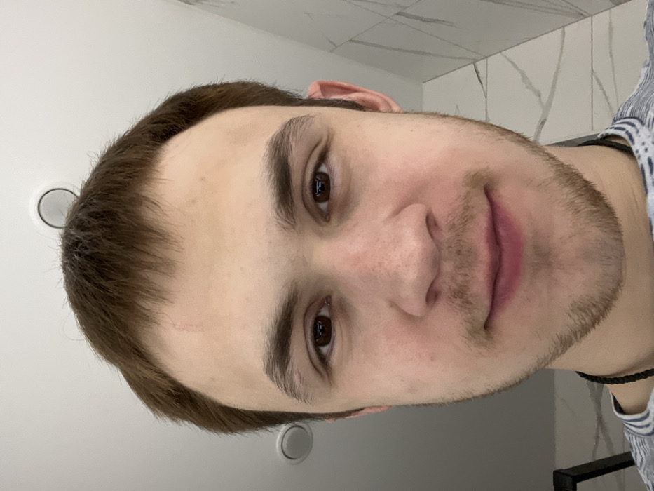 The image displays a head-and-shoulders portrait of a young adult male in an indoor setting in Tlustenkhabl, Russia